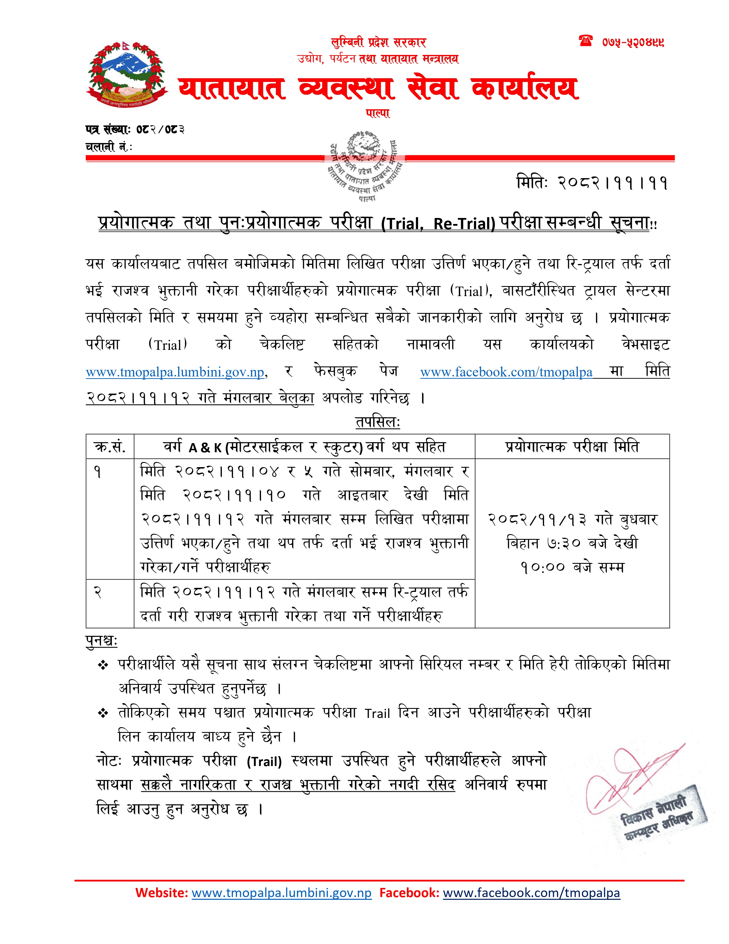 मिति 2082-11-13 गते बुधबार हुने प्रयोगात्मक तथा पुनःप्रयोगात्मक परीक्षा (Trial, Re-Trial) सम्बन्धी सूचना !