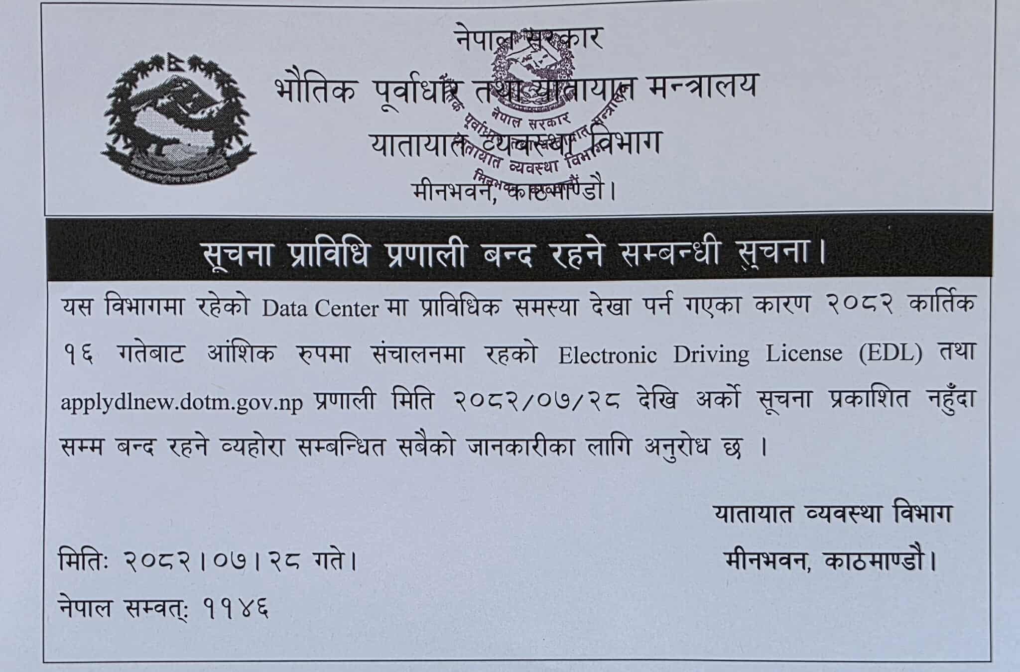 यातायात व्यवस्था विभाग, काठमाण्डौको लाइसेन्स सम्बन्धी सेवा अवरुद्ध सम्बन्धी सूचना !