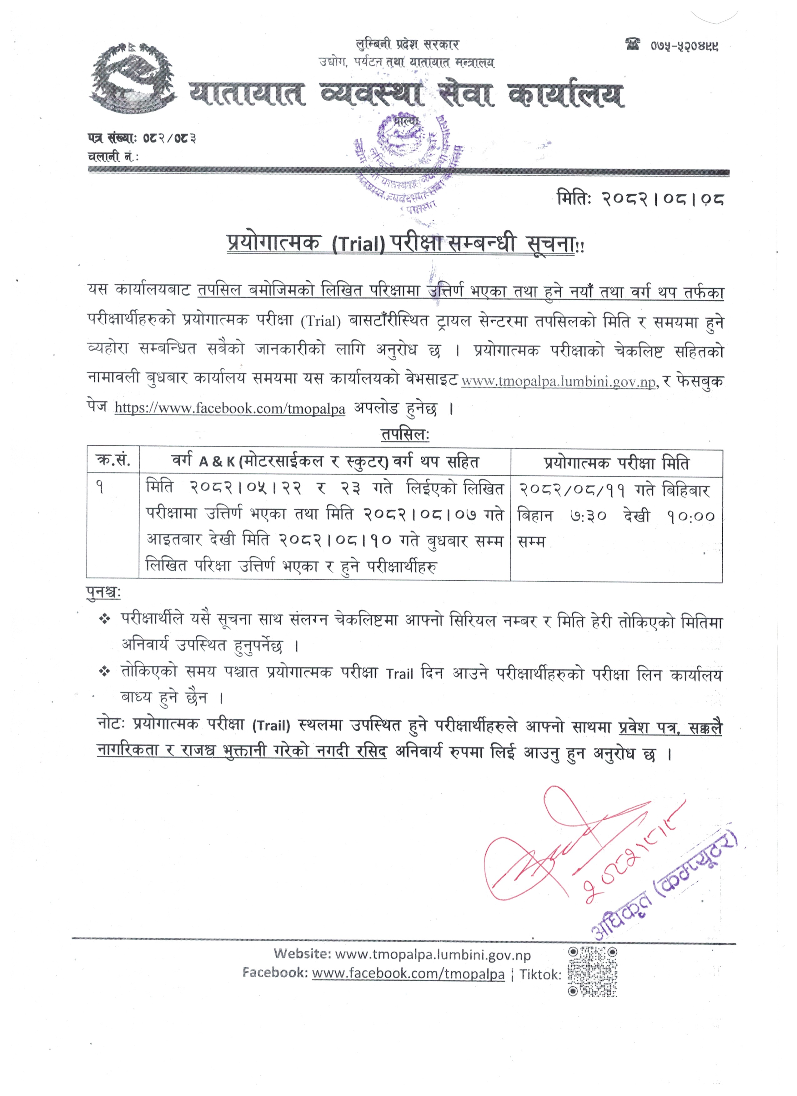 प्रयोगात्मक परिक्षा (Trial) सम्बन्धी सूचना !